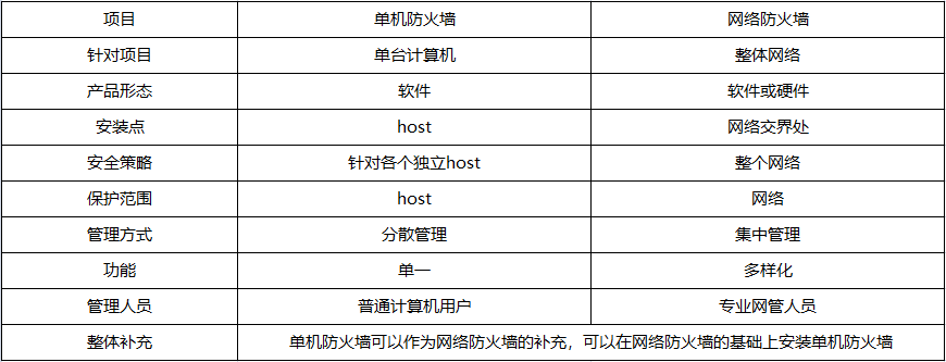 2.防御對象方面,可分類為單機防火墻與網(wǎng)絡防火墻,區(qū)別于防御對象。