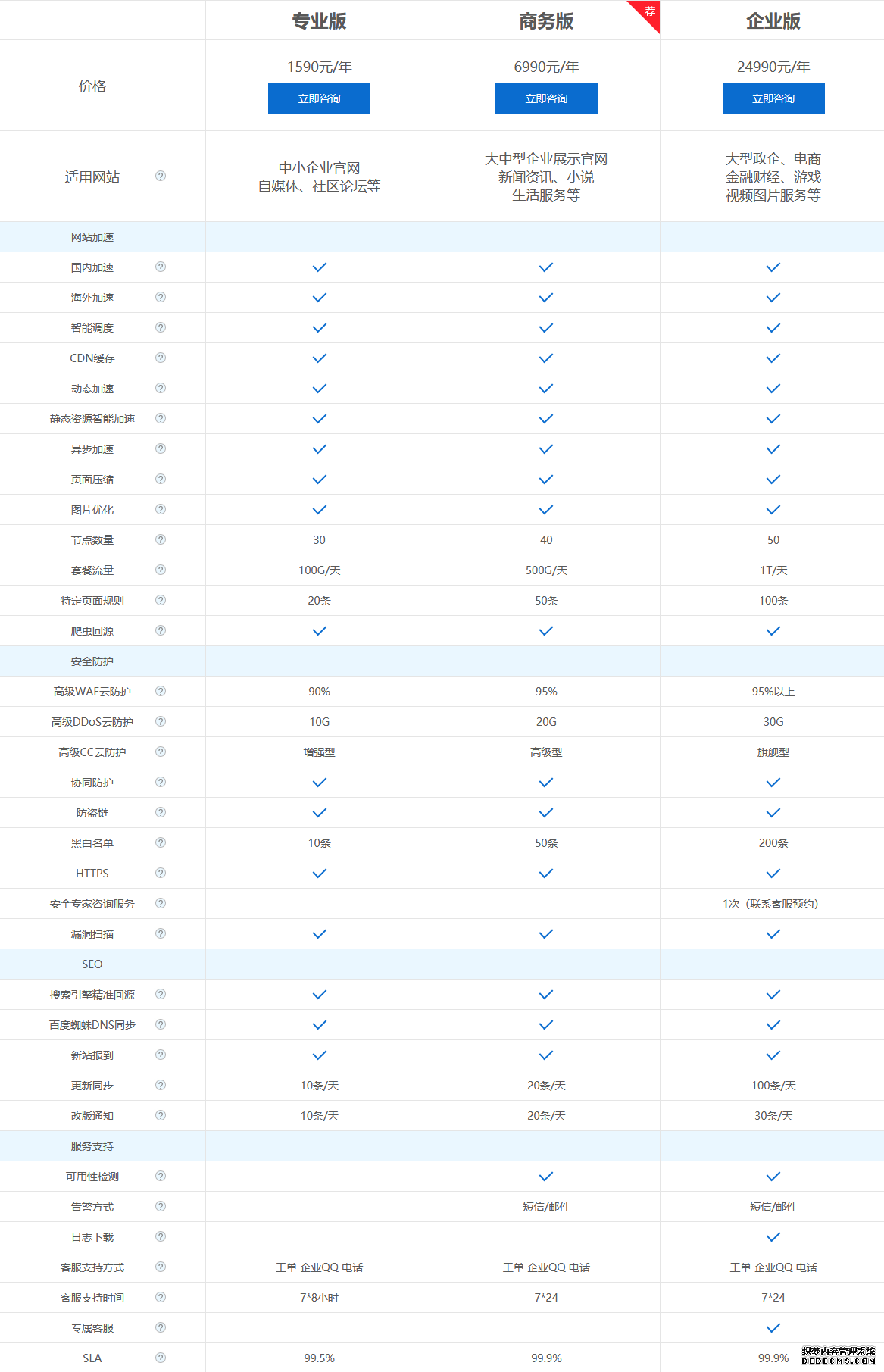 | 產(chǎn)品類(lèi)型 | 適用網(wǎng)站 | CDN節(jié)點(diǎn) | 套餐流量 | CC防護(hù) | DDoS防護(hù) | SEO更新同步 | 客戶支持 | SLA可用性 | 價(jià)格 |