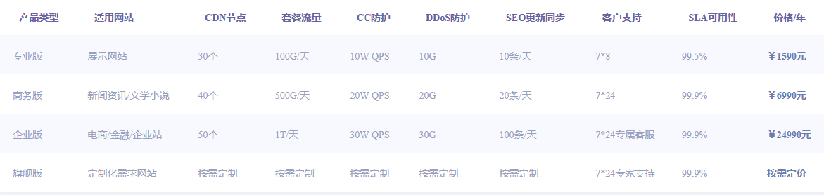 | 產(chǎn)品類型 | 適用網(wǎng)站 | CDN節(jié)點 | 套餐流量 | CC防護 | DDoS防護 | SEO更新同步 | 客戶支持 | SLA可用性 | 價格 |